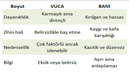 VUCA ve BANI arasındaki temel farklara bakarsak; dört ayrı boyutta bir değerlendirme yapabiliriz.